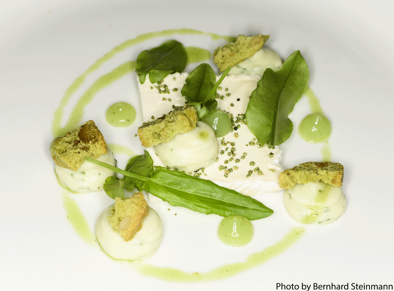 Rucola Granité, grüne Mango, Olivenöl Mousse