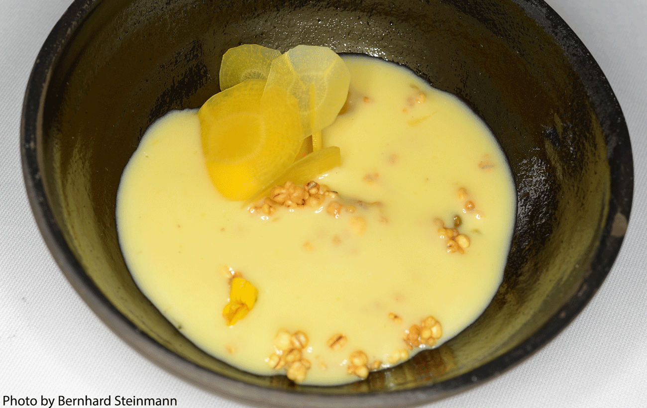 Tanja Grandits ist nicht nur eine herrvorragende Köchin, sie ist auch eine großartige Gastgeberin. Der erste Gang wird von ihr am Tisch finalisiert. So sucht und findet sie den Kontakt mit ihren Gästen.