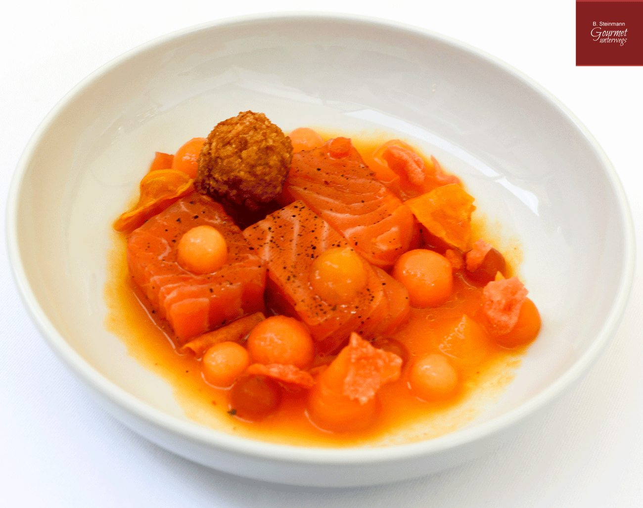 Lachs Sashimi Zimt Salz, Melonen Ceviche, Reis Fritter