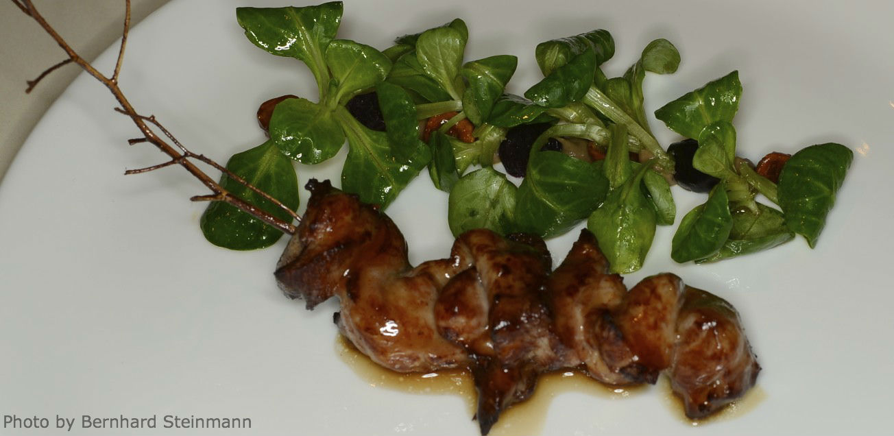 Friedrichs präsentiert eine Perlhuhnbrust am Hagebuttenast und erntet ein Extralob für diesen Einfall.
