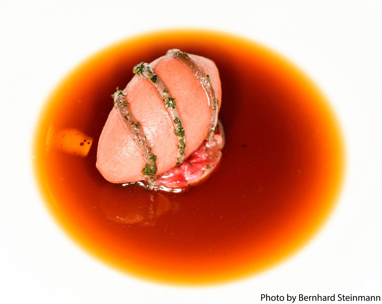 Serviert wird ein Tomaten-Himbeereis angegossen mit einer Krustentieressenz.