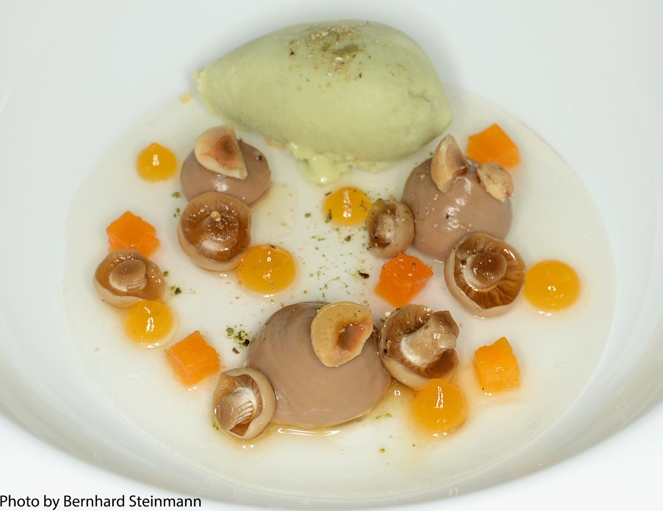 Vollmilchschokolade, eingelegte Pilze, Haselnuss, grüner Tee