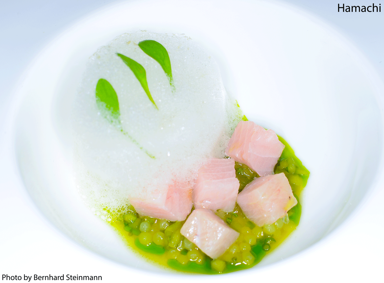 Gelbflossenmakrele mit grünen Peperoni und einem aromatischen Misoschaum.