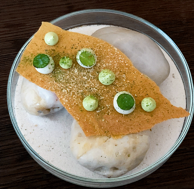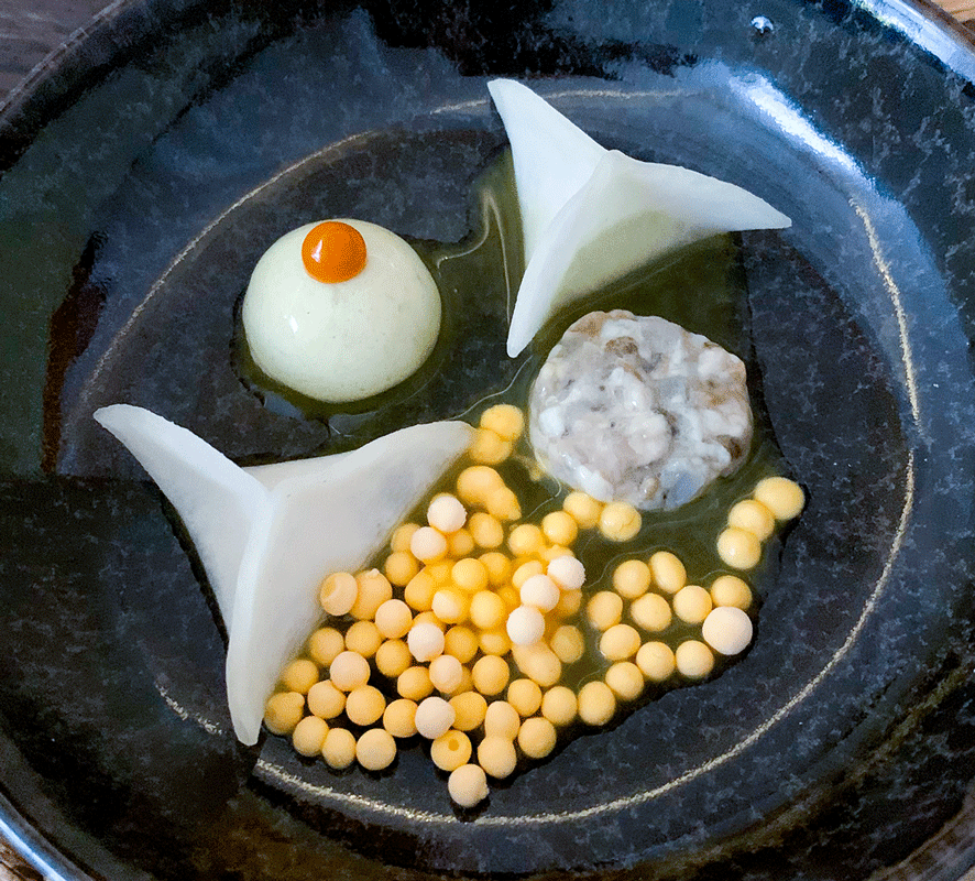 Die Auster wird als Tatar serviert und als Sphäre. Hinzu kommt ein kräftig schmeckender Austernsanddornsud und ein Austern-Brotchip.