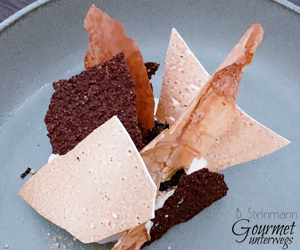 Neben Eis und Trüffel gibt es reichlich Chips. Nein, nicht die aus der Werbung mit Lukas Podolski und Bastian Schweinsteiger sondern Milchhautchips, Steinpilzchips und ein geflämmtes Baiser als Chip.