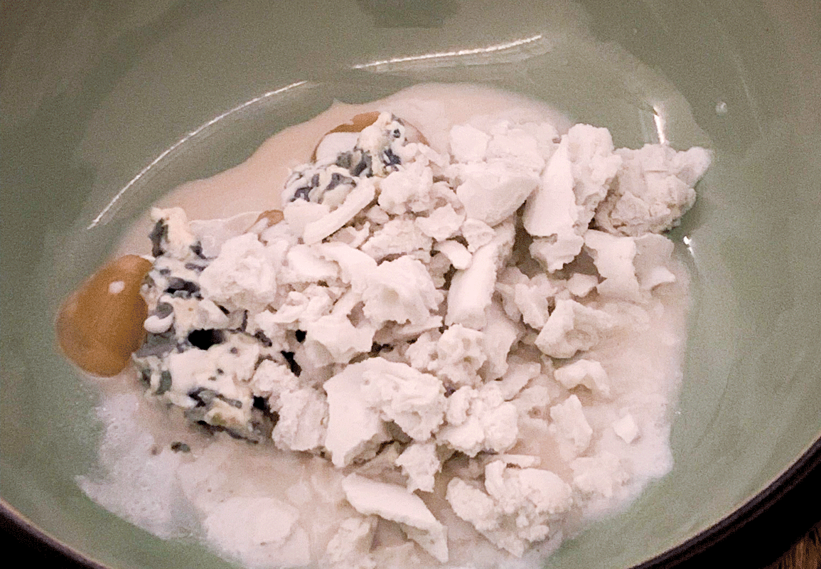 Der Käse kommt geeist und als Espuma mit Birnengelee und Birnensaft auf den Teller, dazu gibt es eine köstliche Haselnussmilch.