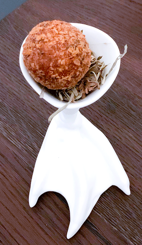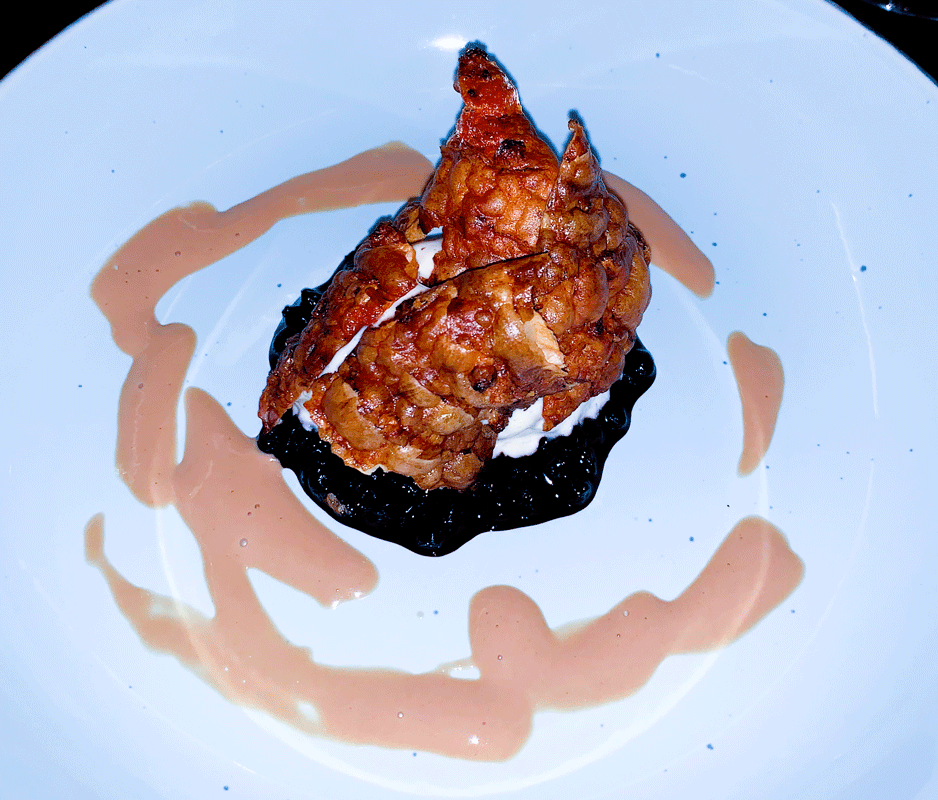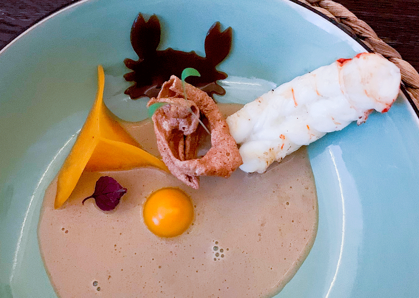 Der Kaisergranat wurde im Wasserbad gegart und leicht abgeflämmt. Etwas Butternutkürbis steuert Butteraroma und eine dezente Süße bei. Doch das ist längst nicht alles. Krustentiergelee, ein Krustentierchip und eine Krustentiersauce sind überaus köstlich. Leichte Säurenoten runden das Ganze ab.