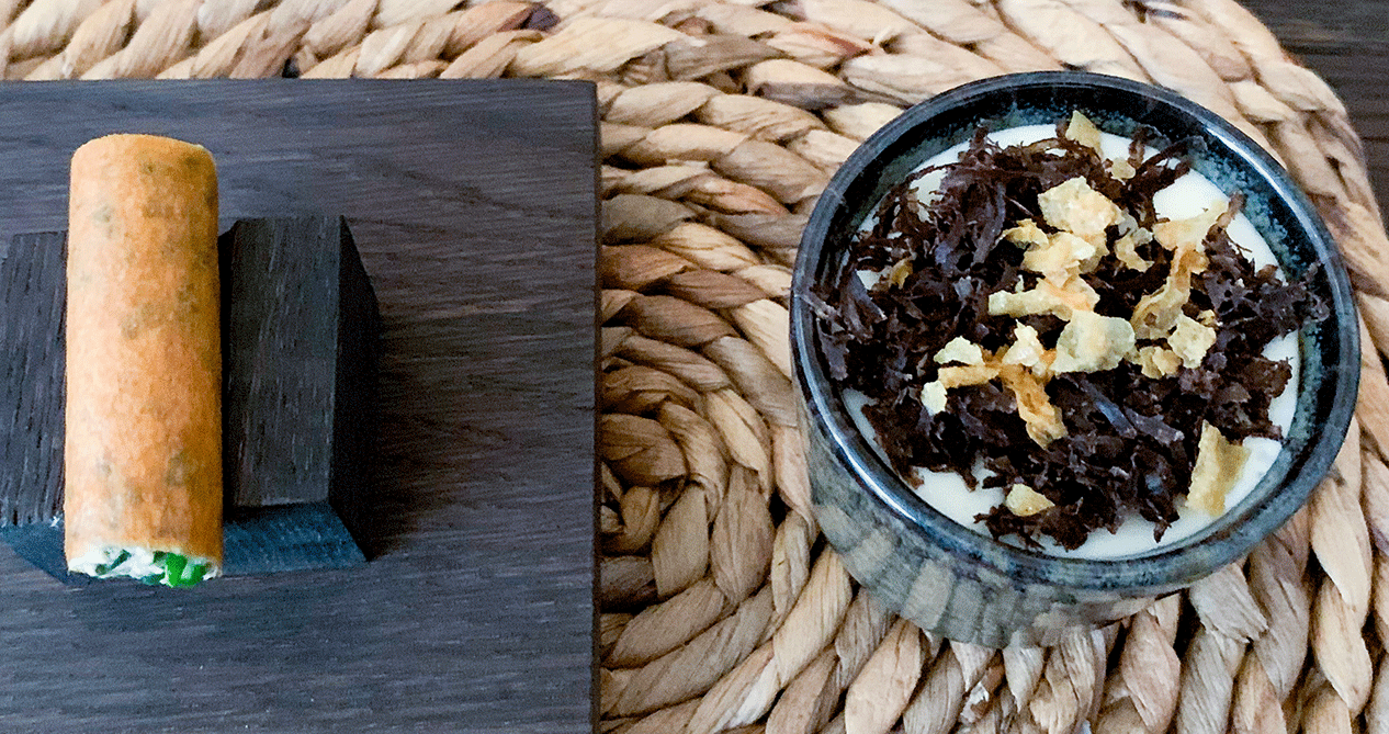 Die Tobinamburschale wird ausgekratzt und frittiert. Hinzu kommt ein erfrischendes Eis mit rauchigem Geschmack und mit brauner Butter angesetzter Malzschaum. Für die nötige Säure sorgen Holunderbeeren.