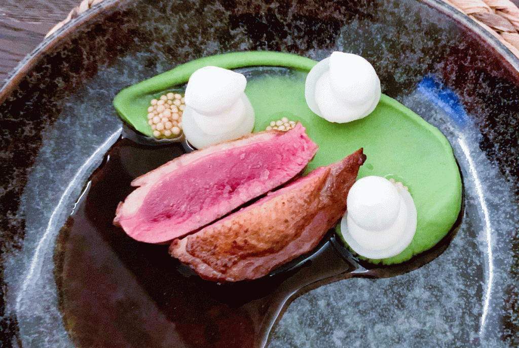 Wer eine Miéral-Taube auf dem Küchentisch liegen hat, hat schon sehr viel richtig gemacht. Die gebratene Taube wird mit Brokkoli-Mousseline serviert. Hinzu kommen eingelegte und gepuffte Perlzwiebel. Etwas ausgebackene Taubenbrust wird ebenfalls gereicht.